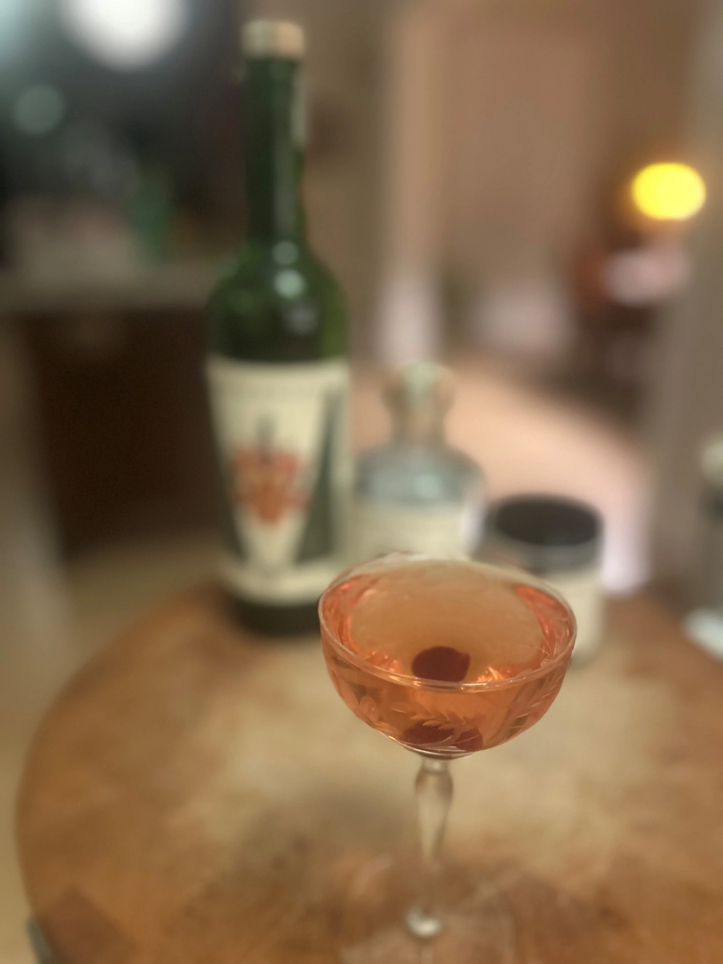 Stir with ice, strain into chilled coupe, and garnish with a brandied cherry.