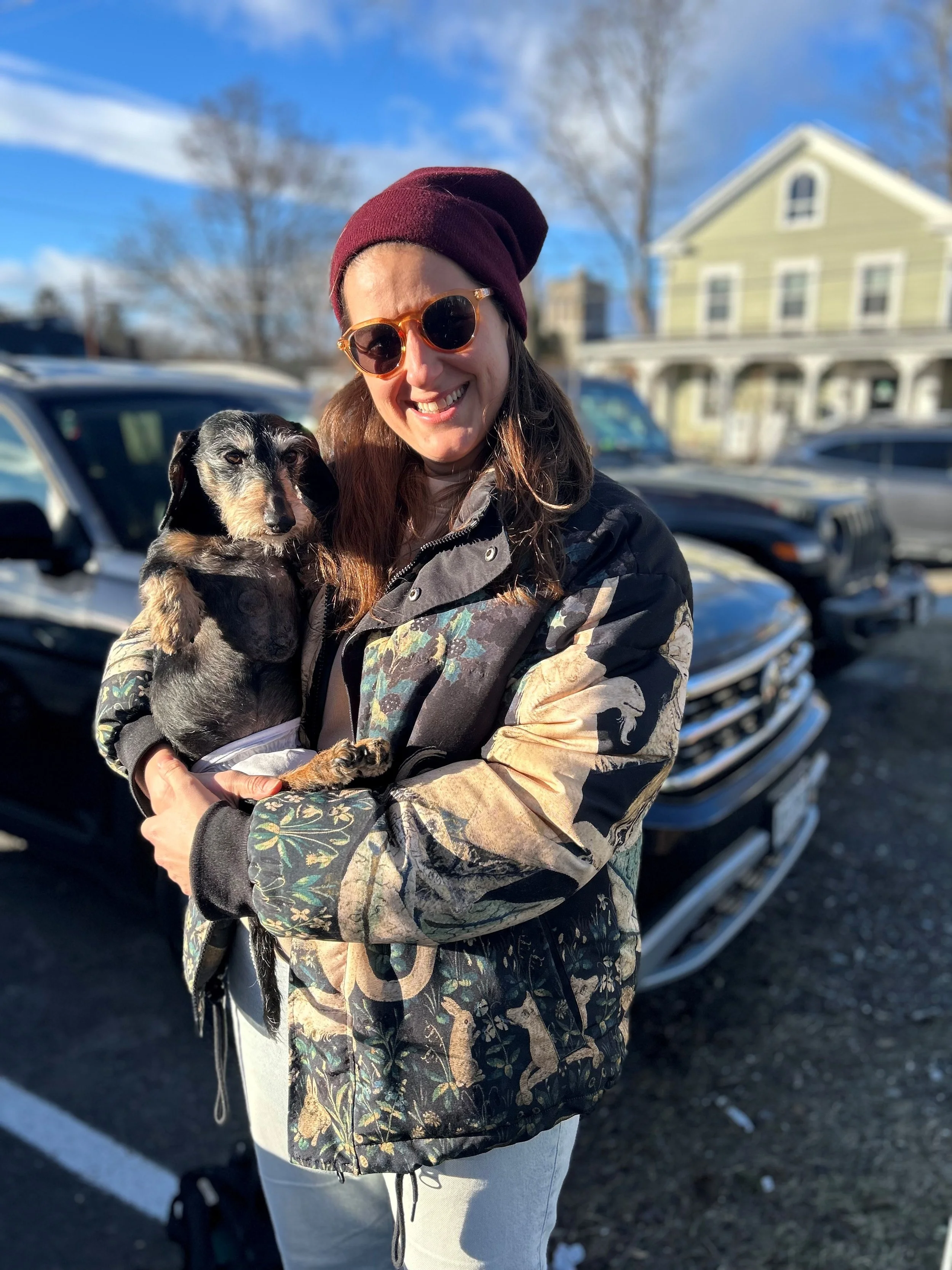 Michelle and her Dachshund Giuseppe during their visit to the farm in 2025. Michelle currently heads up Row 7’s chef collaborations and events.