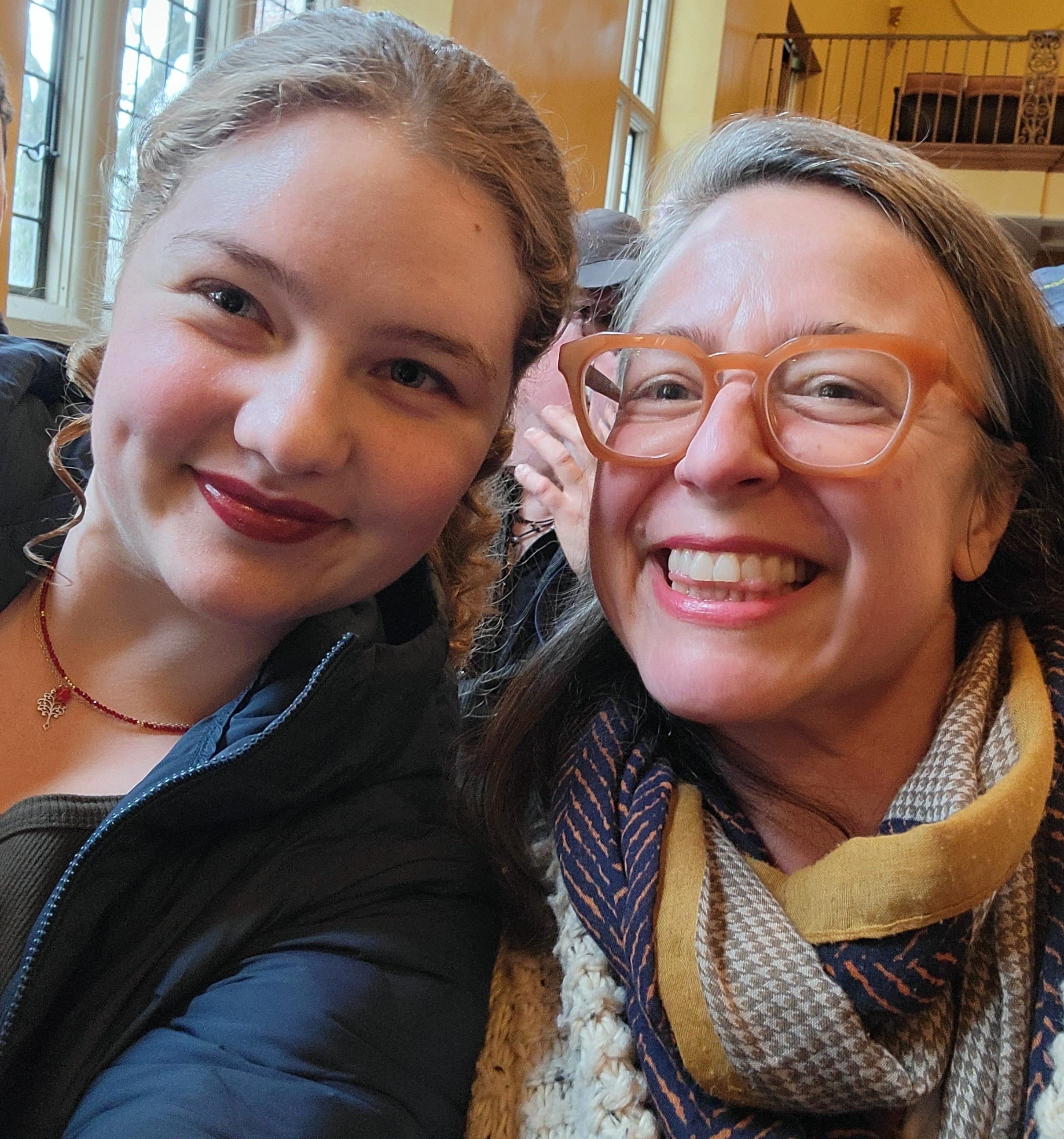 Two giddy women waiting to hear Robin Wall Kimmerer speak at an event at Wellesley College in early March