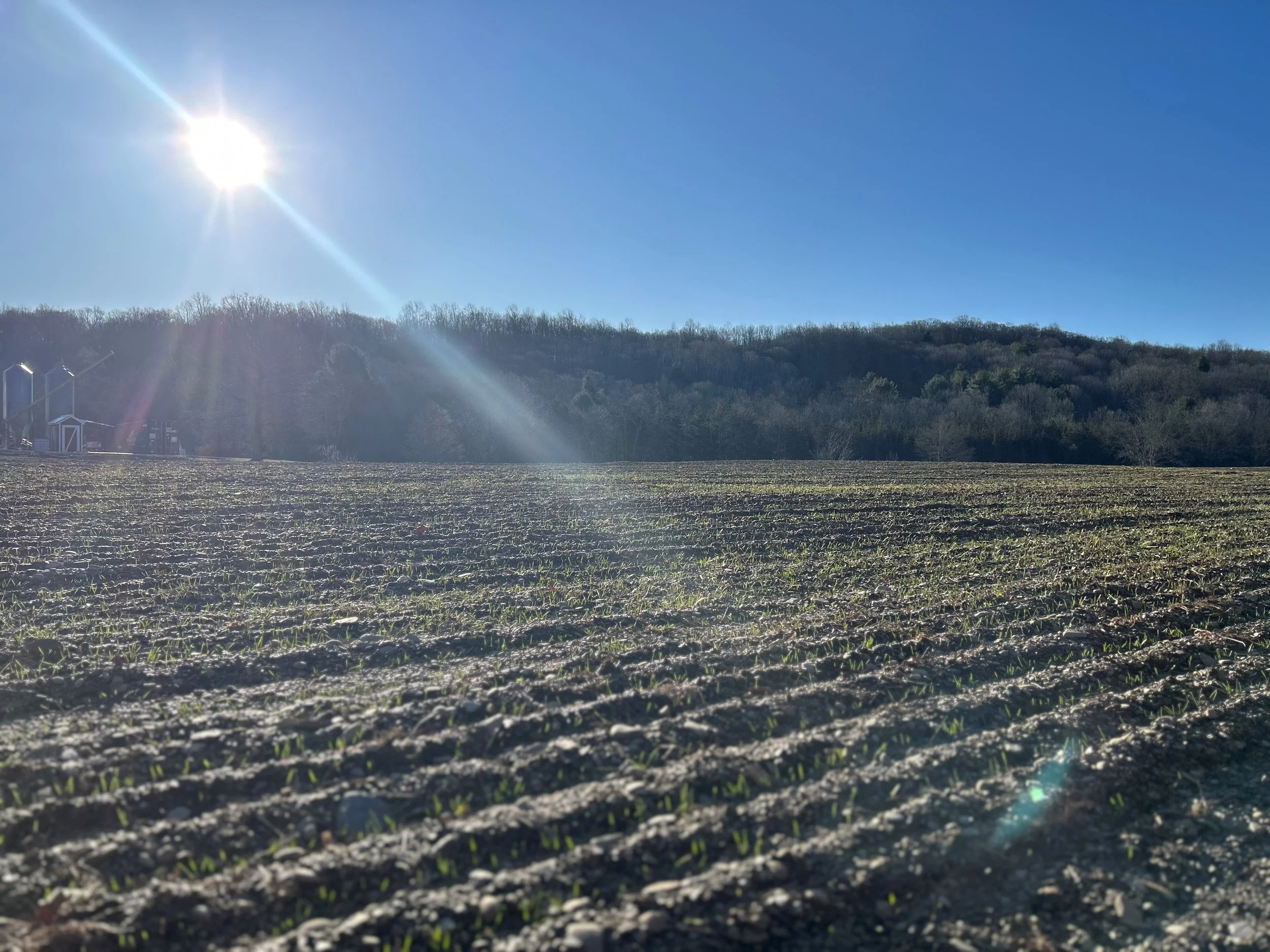 Kevin was a little late in planting our winter crops last year. Ideally, we would get the winter grains in the ground by September 15, but fall is always a really busy time here and we were nearing the completion of a major home renovation as well, so it got pushed back. Kevin managed to get the field next to the barn planted to winter wheat in October, but he didn’t get to the big field to plant in time before an early winter came on. This is the first year we will do a spring planting—of wheat in the big field. Over the winter, Kevin spent a decent amount of time admonishing himself for planting so late and worrying that we wouldn’t have a crop this year.